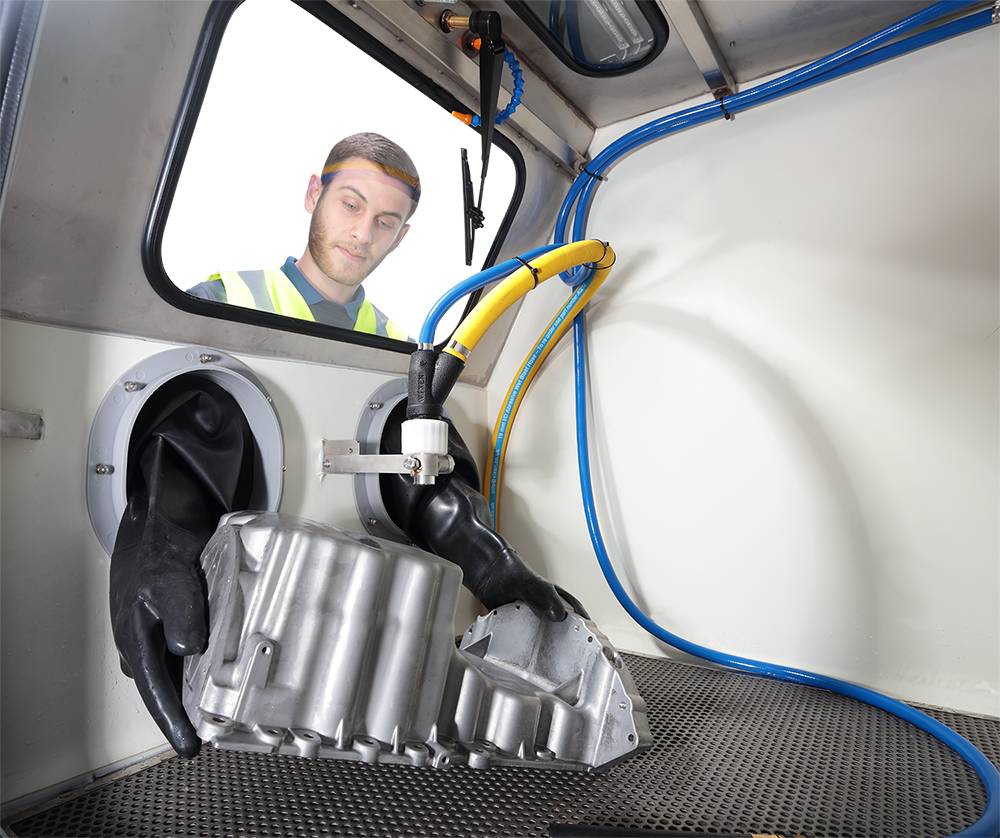 Strahlen und Entfetten in einem Schritt für eine glattere Oberfläche als beim Trockenstrahlen. Staubfreier Prozess mit minimaler Gefahr des Einschlusses von Strahlmittel, ideal für Nichteisenmaterialien und Restaurierungsprojekte.